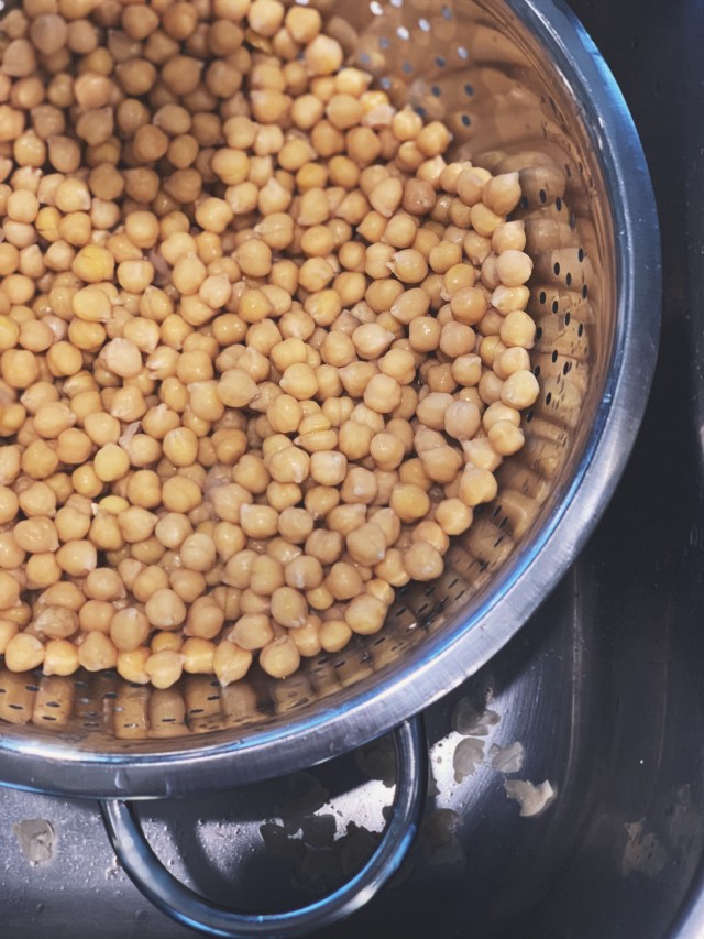 Whenever you have time the next day, strain the chickpeas and chuck them in a pot with water again, an inch or two over the chickpeas and let them boil until the water is at the same level they are, and have softened. Then you can strain and rinse them. Usually it’s about 20-30 minutes. I fold my washing in that time or chuck on an episode of something haha. Or both.